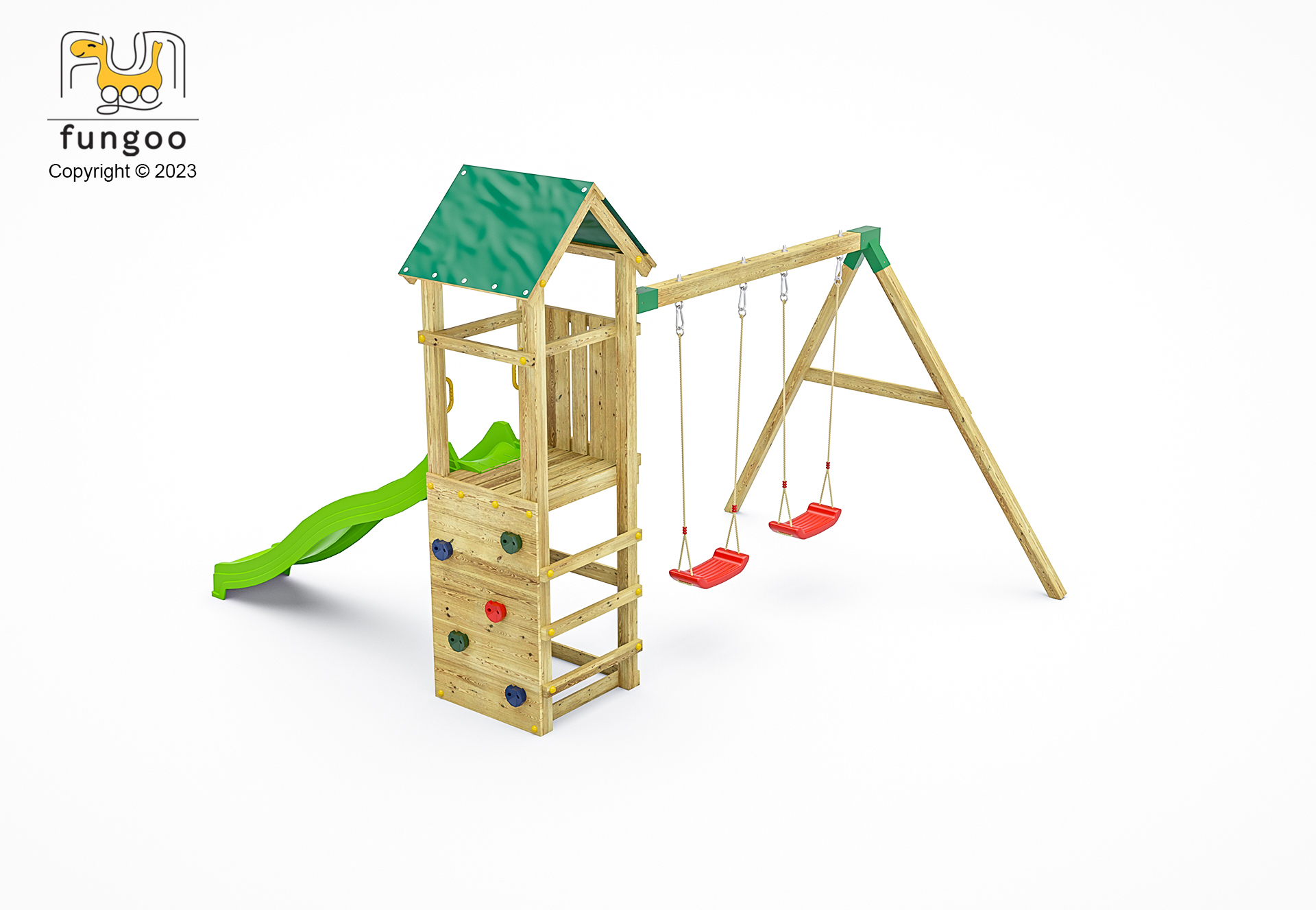 A synthetic roof adds a touch of style and functionality to the FUNGOO Charly. This waterproof feature protects the play area from rain, allowing children to continue their adventures regardless of the weather. The roof also adds to the overall aesthetic of the playset, making it an attractive addition to any backyard.