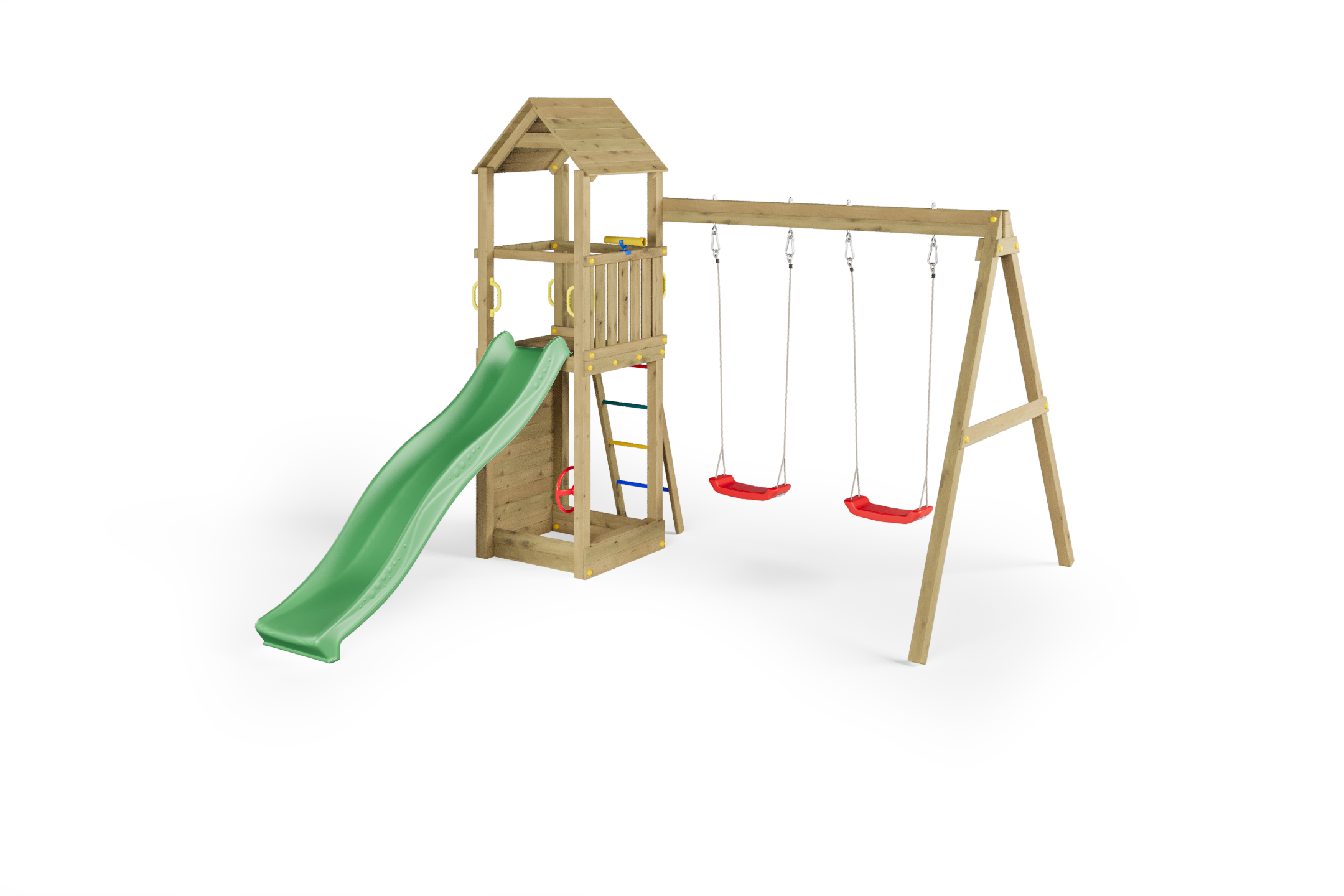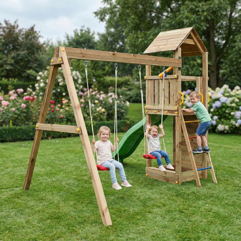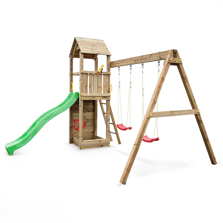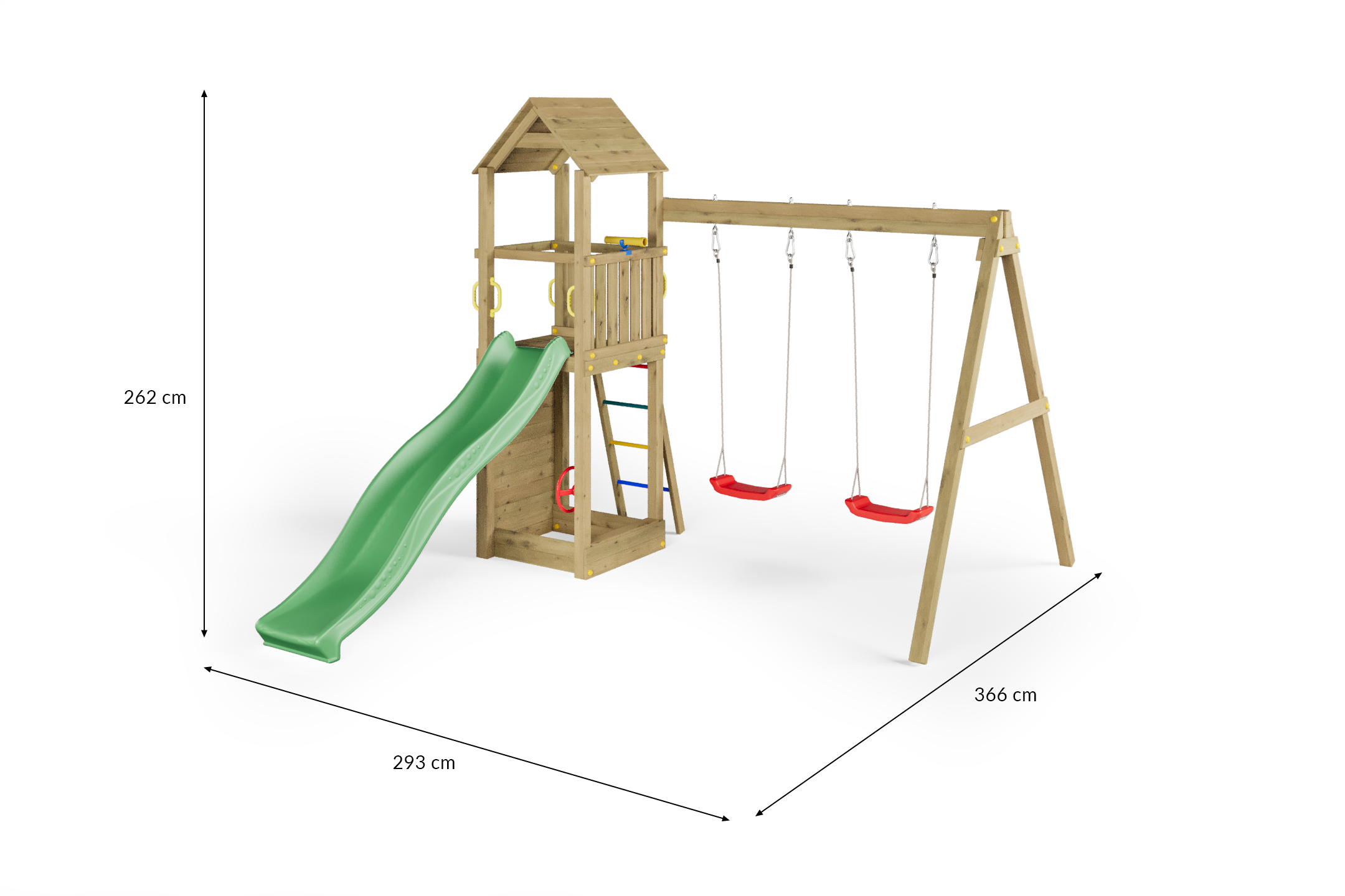 The playset also includes two RED FLAT swing seats, each equipped with hooks and ropes for easy adjustment. These swings are crafted for comfort and durability, offering a classic swinging experience that children love. Whether they’re soaring through the air or gently swaying, kids will enjoy endless hours of fun on these swings.