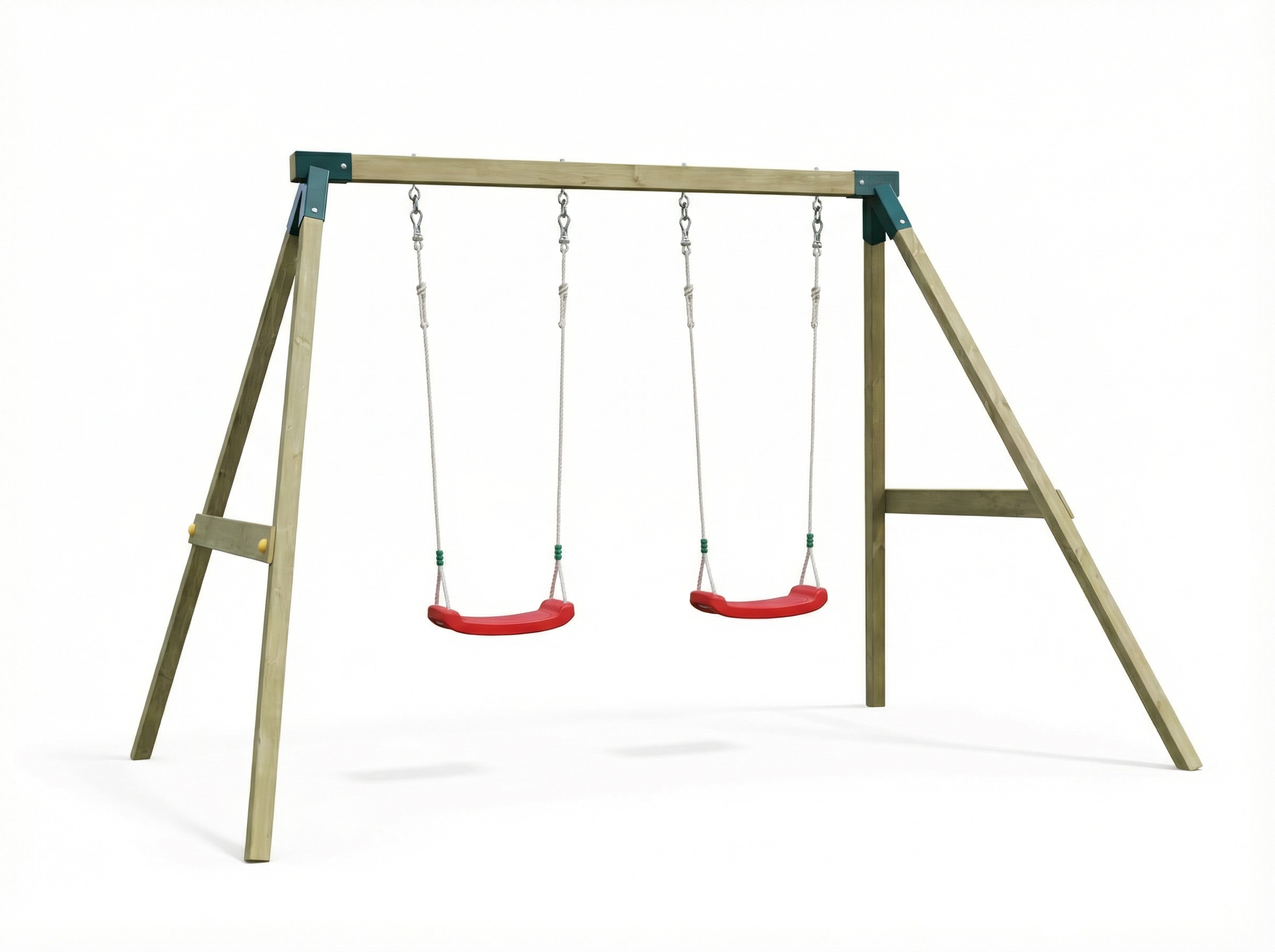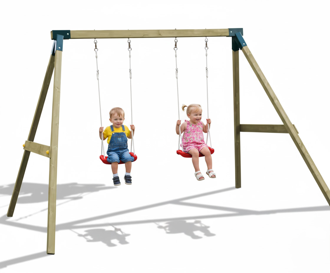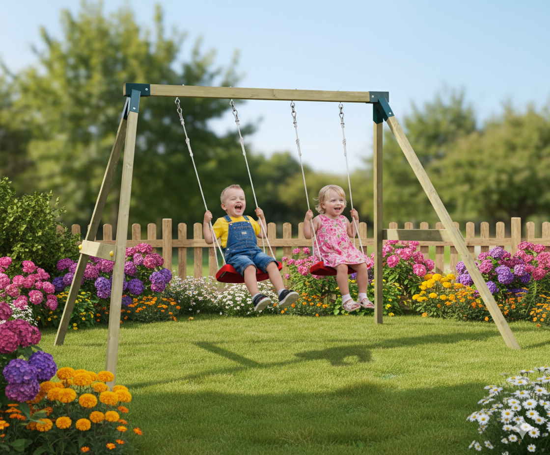 The structure is built around a heavy-duty metal connector system, which ensures a quick and easy construction process while providing maximum rigidity for the wooden frame. This robust joint system is specifically designed to handle the dynamic forces of two children swinging simultaneously, ensuring the playset remains a reliable fixture in your garden for years to come.
