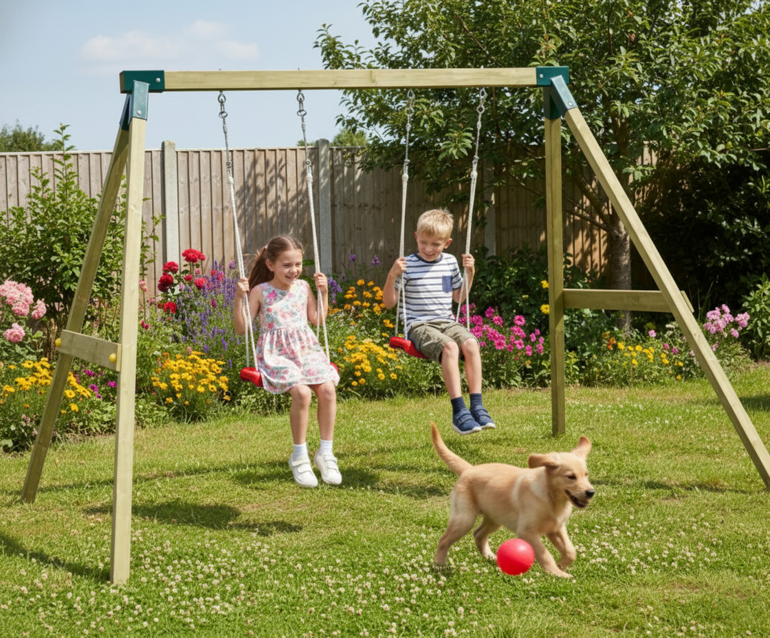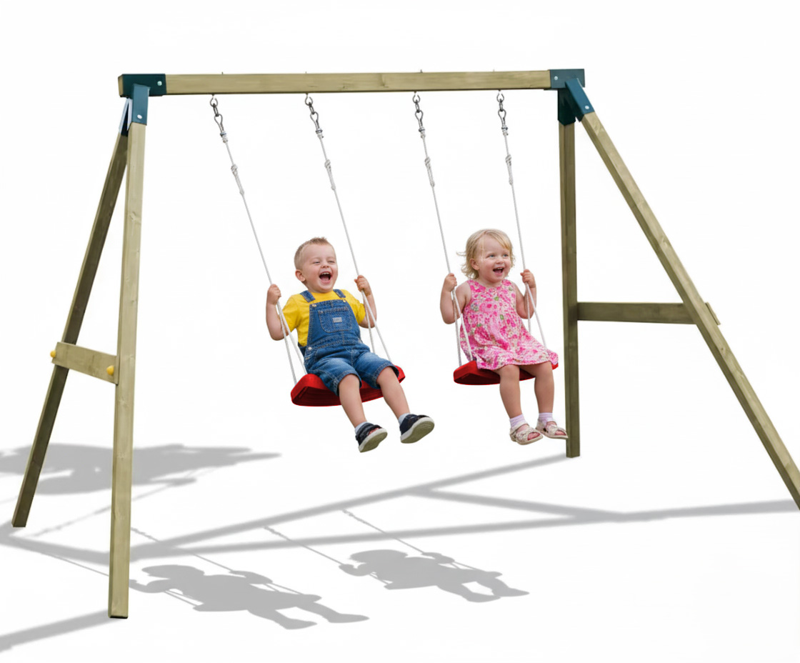 The set includes two durable swing seats complete with adjustable ropes and secure hooks, making it easy to customize the height as your children grow. Crafted from a high-quality set of timber, the frame is designed to blend naturally into your outdoor environment. Assembly is made remarkably simple with the included step-by-step assembly manual and a complete assembly tool kit.