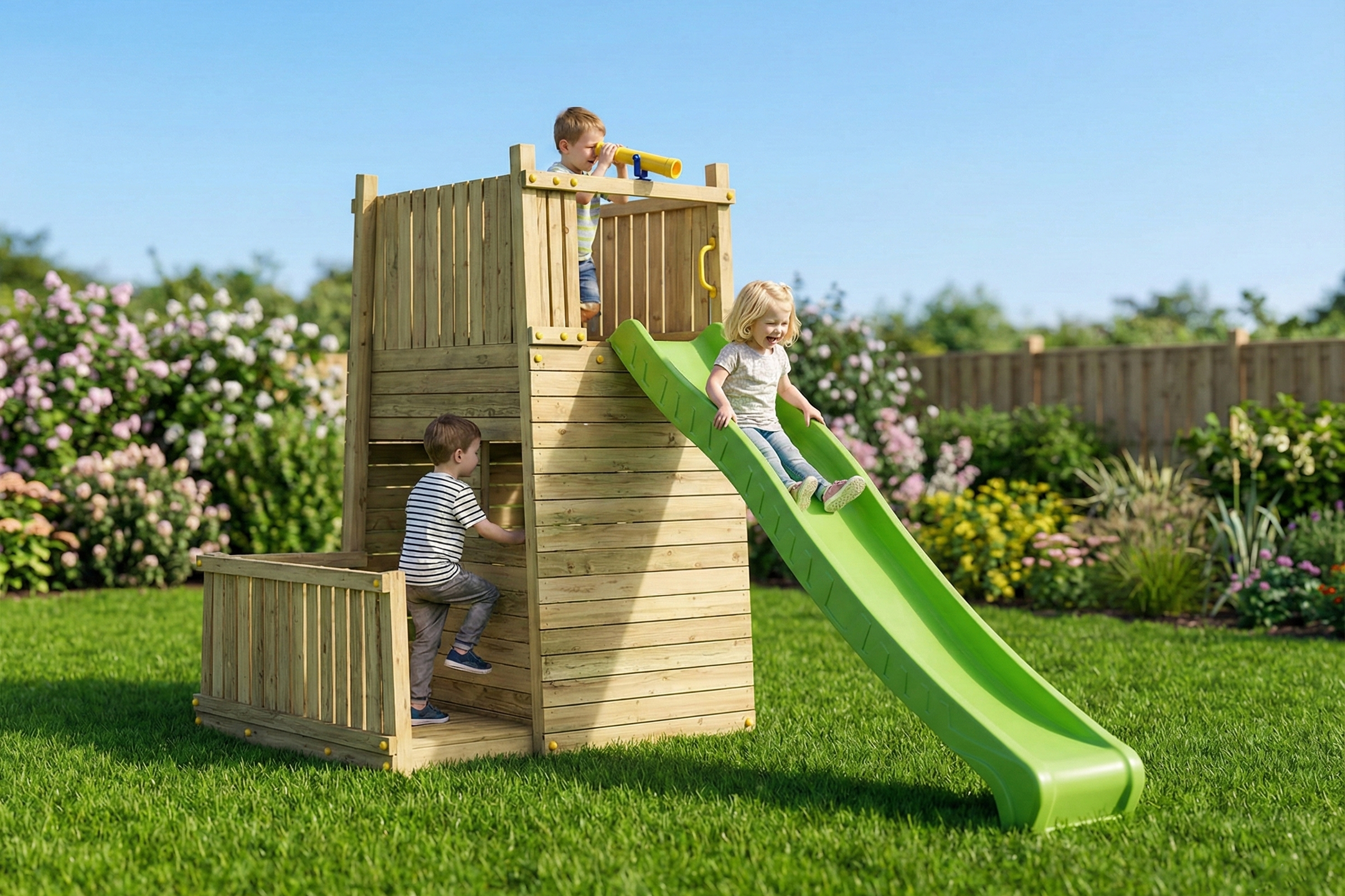 The wooden construction kit is crafted for longevity, featuring high-quality timber and metal fasteners that guarantee a robust build. Inside the tower, a toy telescope awaits, encouraging imaginative role-play as children keep a lookout over their “resort” grounds. Assembly is straightforward with the provided step-by-step instructions and a complete set of mounting accessories.